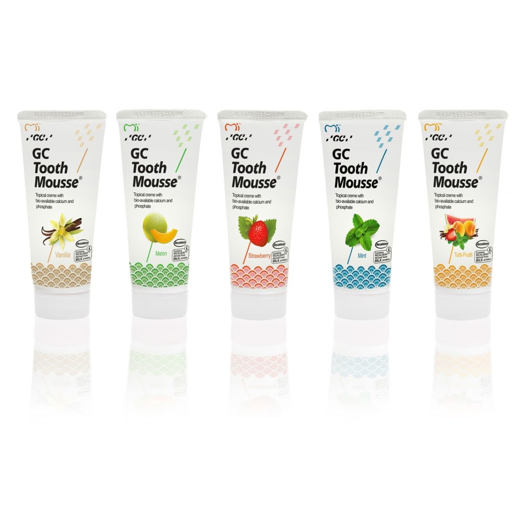 GC Tooth Mousse: a foamy crème available in a range of flavors including Melon, Strawberry, Tutti-Frutti, Mint, and Vanilla.
