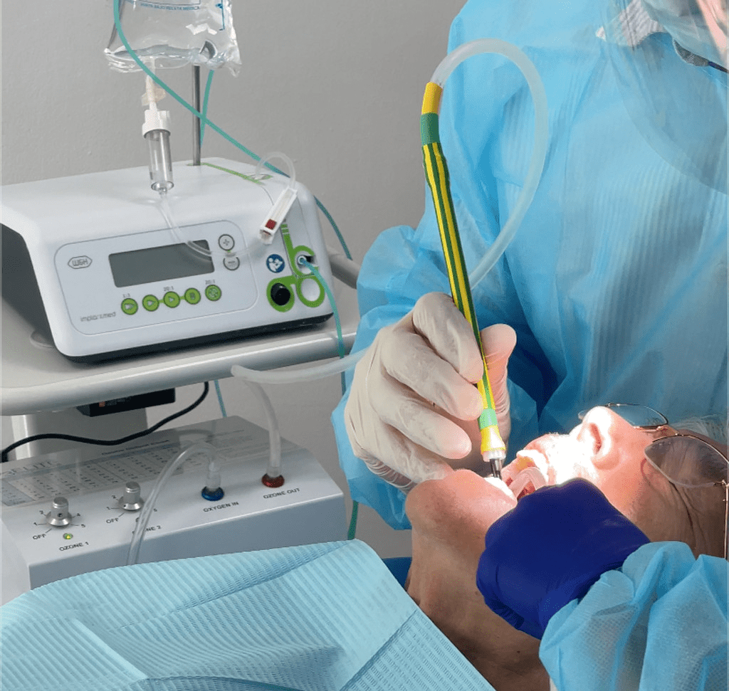 - Ozone gas: Applied directly to treatment sites via silicone cups.